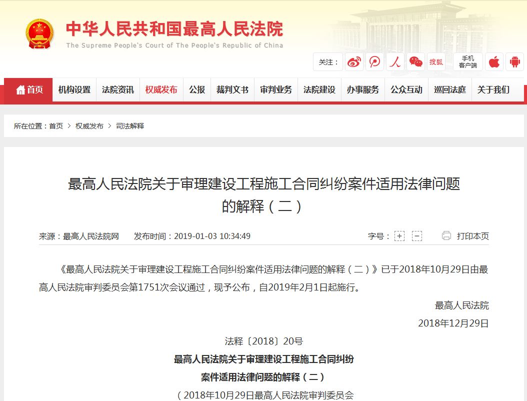近日,更高人民法院發(fā)布《關(guān)于審理建設(shè)工程施工合同糾紛案件適用法律問題的解釋(二)》?!督忉尅方?jīng)更高人民法院審判委員會(huì)第1751次會(huì)議討論通過,將于2019年2月1日起施行。針對(duì)近年來建筑市場(chǎng)的新變化、司法實(shí)踐的新問題、管理政策的新突破,《解釋》就建設(shè)工程施工合同效力、建設(shè)工程價(jià)款結(jié)算、建設(shè)工程鑒定、建設(shè)工程價(jià)